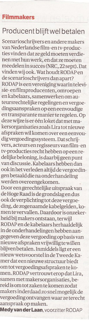 Ingezonden brief van voorzitter RoDAP. NRC zaterdag 27 september 2014
